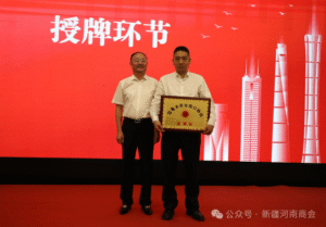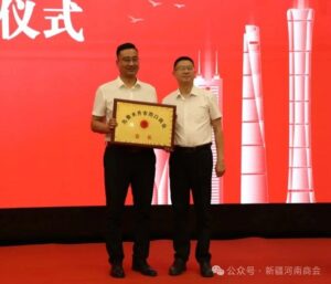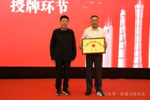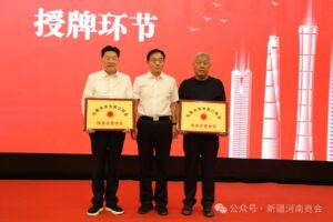 新疆河南商会党支部书记刘涛为乌鲁木齐市周口商会监事长李海迎授牌。