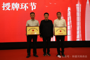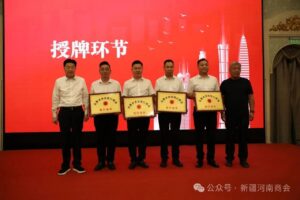 自治区工商联副主席、新疆河南商会会长朱军、新疆河南商会名誉会长陈怀亮为执行会长周金山、刘尊想、朱笑伟、王坤鹏授牌。